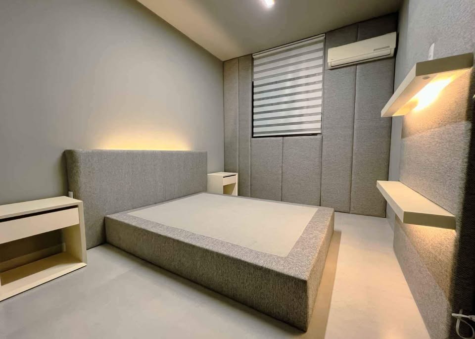 01 suite hóspede com marcenaria em laca cinza claro e painéis em linho e iluminação intimista.