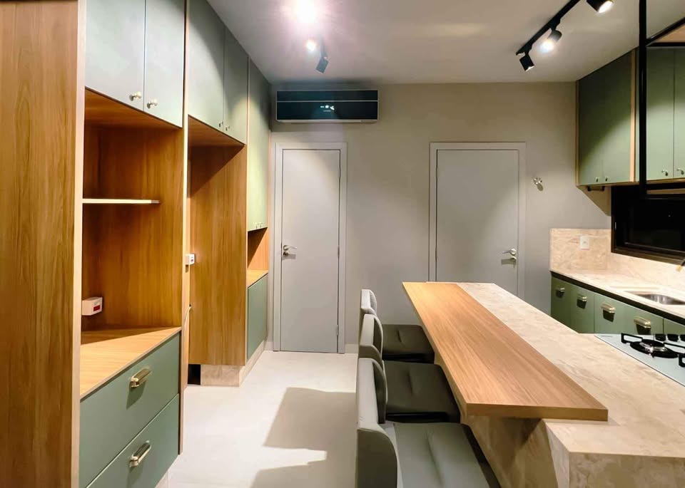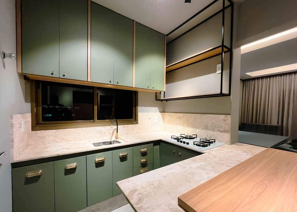 01 cozinha gourmet em laca verde, metais dourados e pedra em mármore fosco.