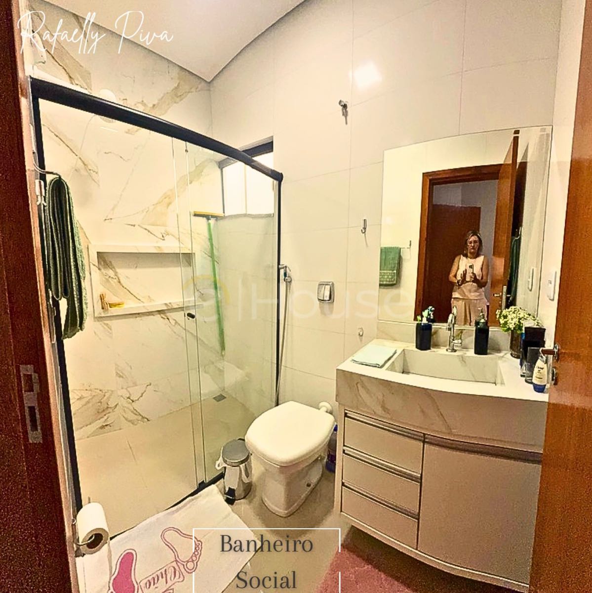 • Banheiro da suíte com box, espelho e móveis planejados